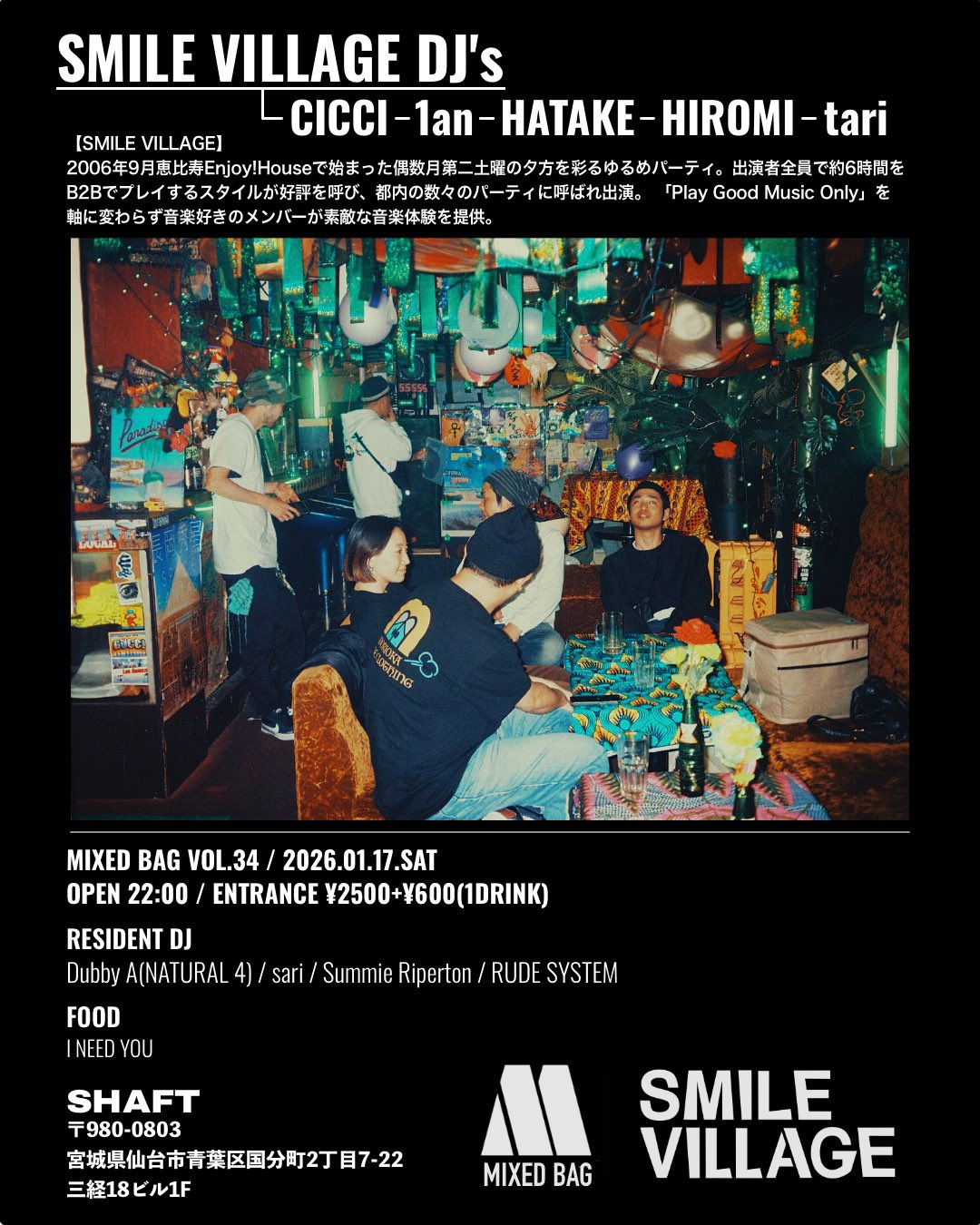 [SMILE VILLAGE] 2006年9月恵比寿Enjoy!Houseで始まった偶数月第二土曜の夕方を彩るゆるめパーティ。出演者全員で約6時間をB2Bでプレイするスタイルが好評を呼び、都内の数々のパーティに呼ばれ出演。 「Play Good Music Only」を軸に変わらず音楽好きのメンバーが素敵な音楽体験を提供。