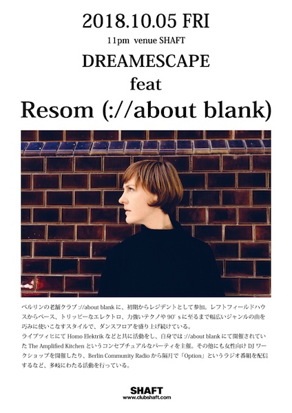 ALL ELECTRONIC MUSICをテーマに掲げDJ YUIのオープンクローズのDJを基軸とするDREAMESCAPEは、これまでにasyl cahier、Asusu(Livity Sound)、Bruce ( Hessle Audio / Timedance )、Ko Umehara等といった国内外の尖鋭達を交え、東北は仙台の地に先端のElectronic music soundを提案している。 今回は、エレクトロニックミュージックシーンにおいて隆盛を極める都市ドイツはベルリンより、名店://about blankのレジデンシーResomがDJを披露。ベルリンのハードなクラバー達を唸らせる彼女のDJスキル、エクレクティックなサウンドを時間を忘れて楽しんで貰いたい。