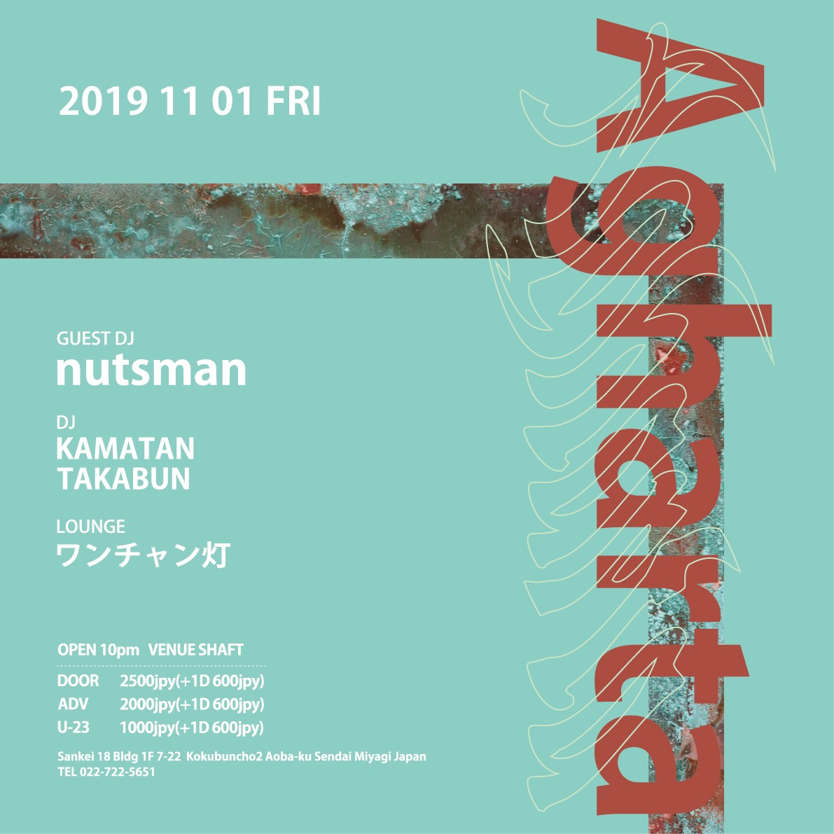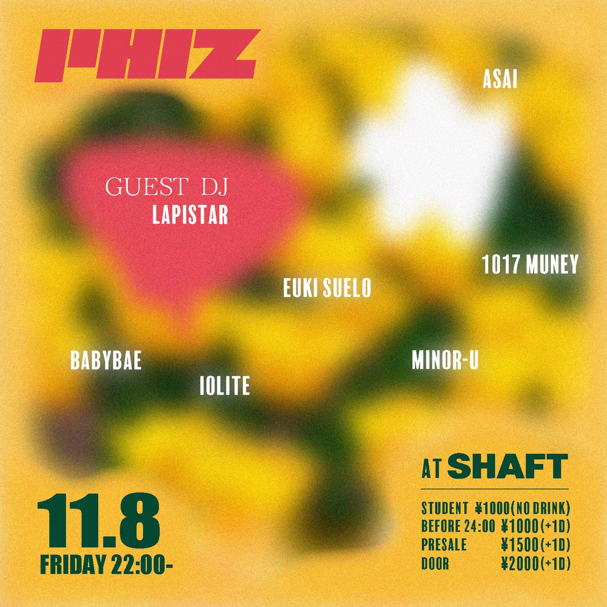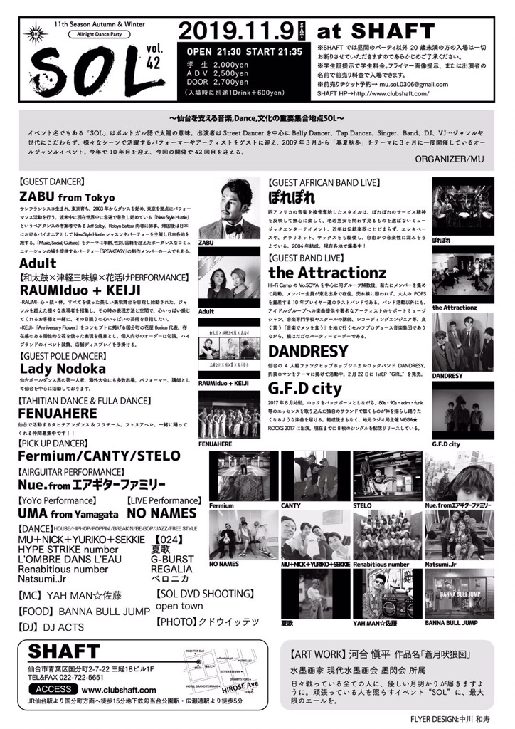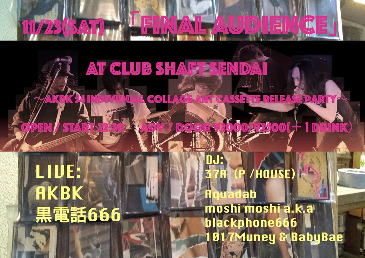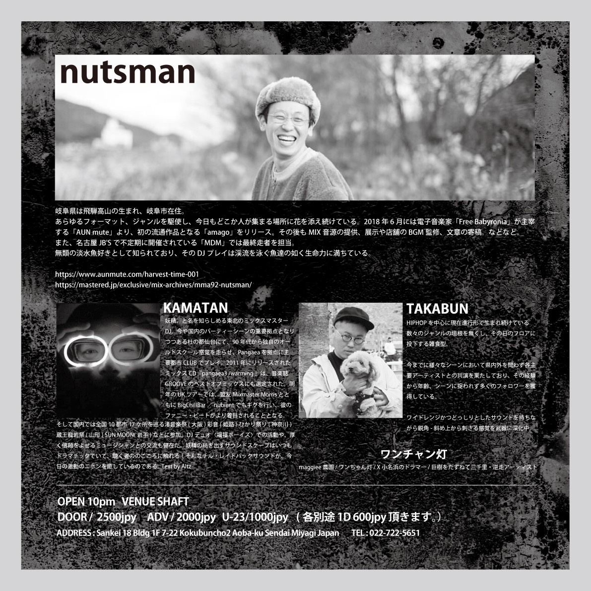ADMISSION FEE/ DOOR/2,500yen(+1D 600yen) ADV/2,000yen(+1D 600yen) 学割/1,000yen(No Drink) 県外割/1500yen(w/1D)
