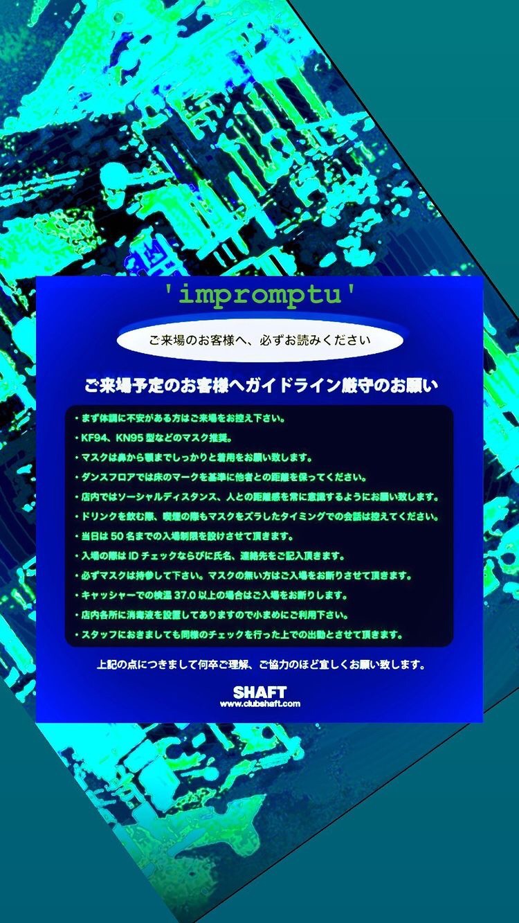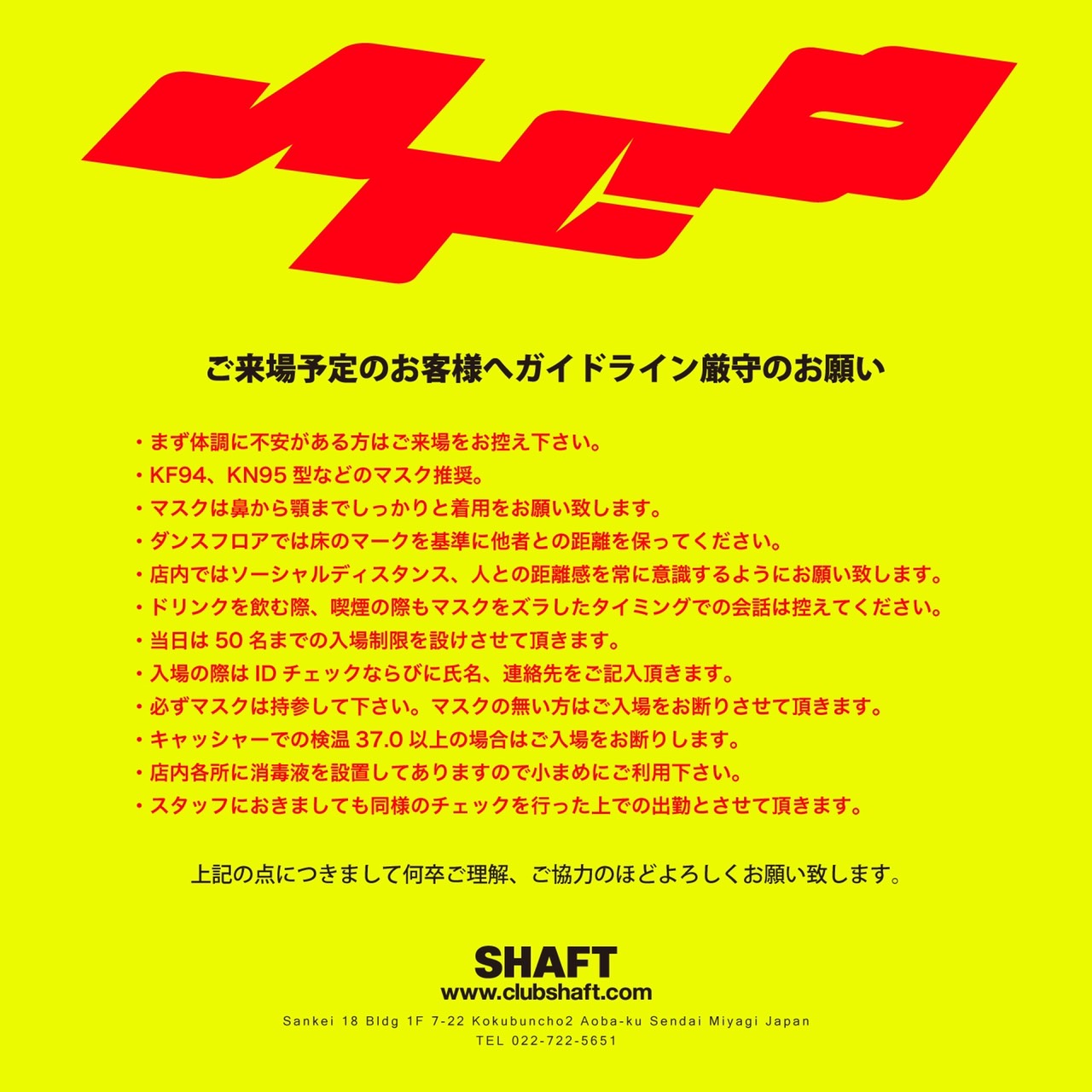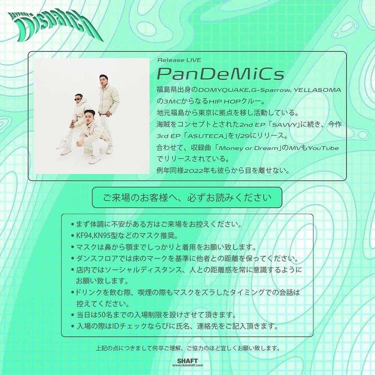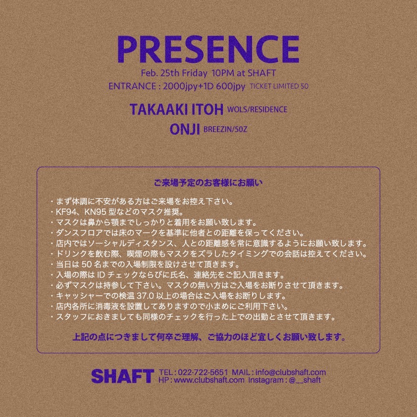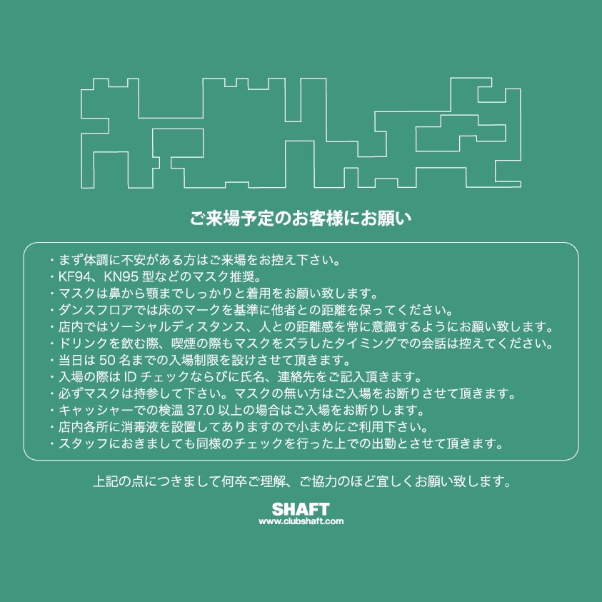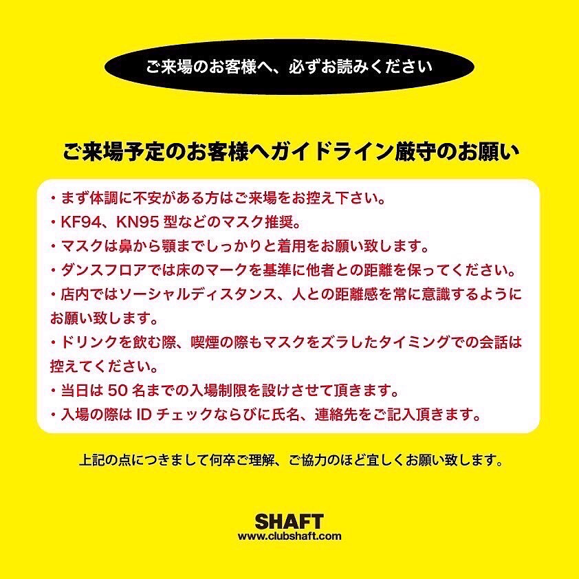 ご来場予定のお客様にお願い □まず体調に不安がある方はご来場をお控え下さい。 □当日は50名までの入場制限を設けさせて頂きます。 □入場の際はIDチェックならびに氏名、連絡先をご記入頂きます。 □マスクは鼻からアゴまでしっかりと着用願いします。KF94、KN95型推奨。 □ドリンクを飲む際、喫煙の際もマスクをズラしたタイミングでの会話はお控え下さい。 □ダンスフロアでは床のマークを基準に他者との距離を保ってください。 □演者へのレスポンスは拍手でお願いします。 □キャッシャーでの検温37.0以上の場合はご入場をお断りします。 □店内ではソーシャルディスタンス、人との距離感を常に意識するようにお願い致します。 □店内各所に消毒液を設置してありますので小まめにご利用下さい。