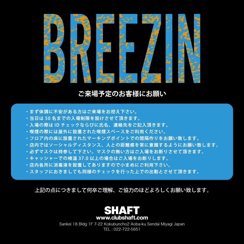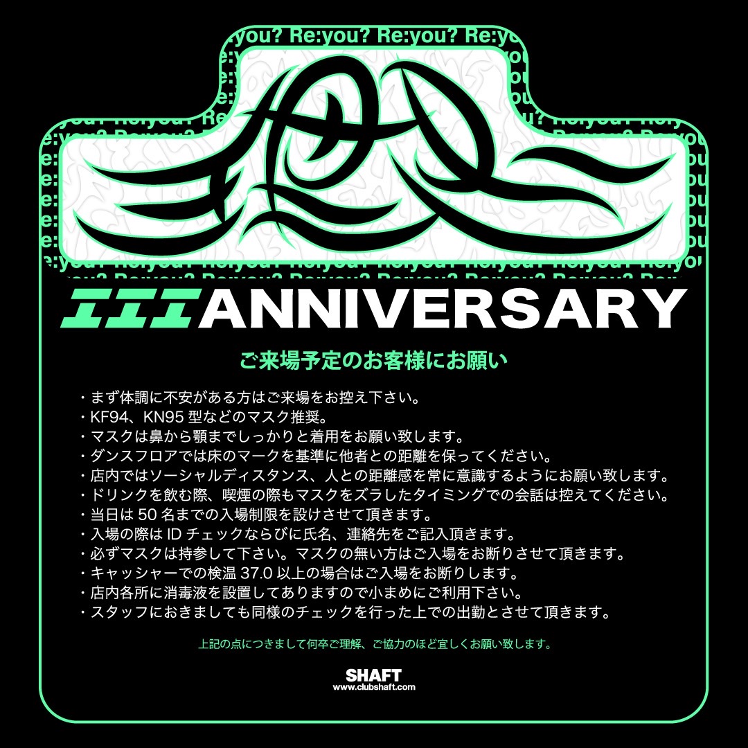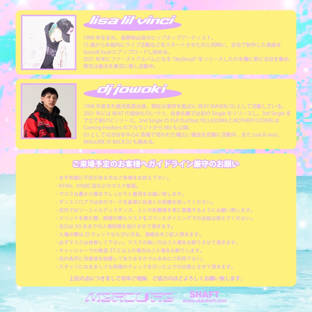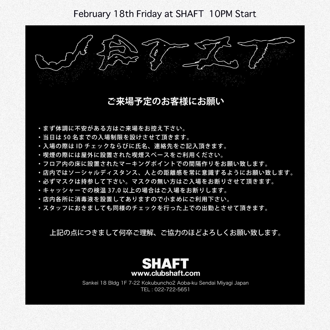 ご来場予定のお客様にお願い □まず体調に不安がある方はご来場をお控え下さい。 □当日は50名までの入場制限を設けさせて頂きます。 □入場の際はIDチェックならびに氏名、連絡先をご記入頂きます。 □マスクは鼻からアゴまでしっかりと着用願いします。KF94、KN95型推奨。 □ドリンクを飲む際、喫煙の際もマスクをズラしたタイミングでの会話はお控え下さい。 □ダンスフロアでは床のマークを基準に他者との距離を保ってください。 □演者へのレスポンスは拍手でお願いします。 □キャッシャーでの検温37.0以上の場合はご入場をお断りします。 □店内ではソーシャルディスタンス、人との距離感を常に意識するようにお願い致します。 □店内各所に消毒液を設置してありますので小まめにご利用下さい。