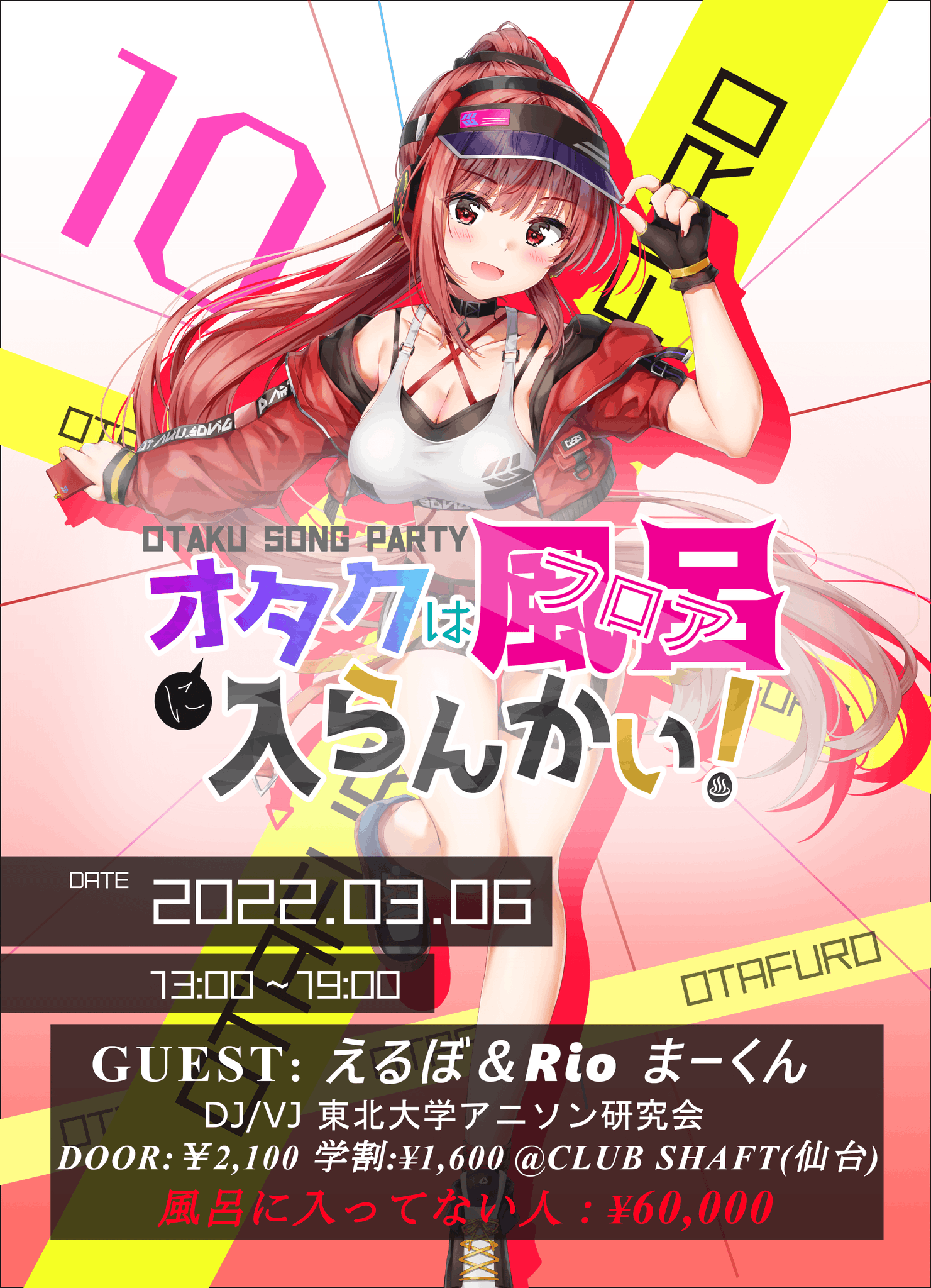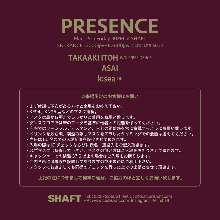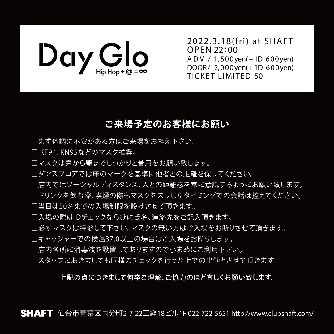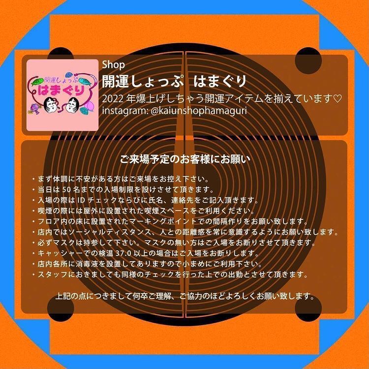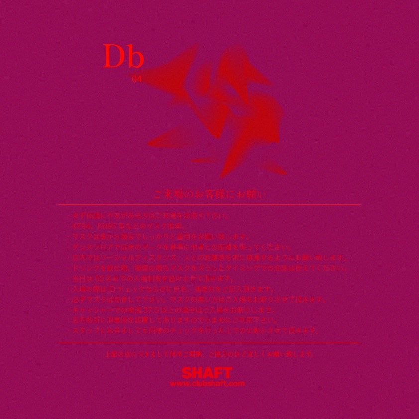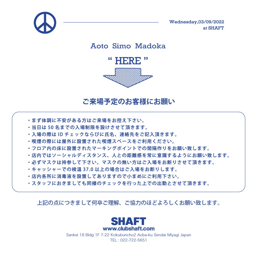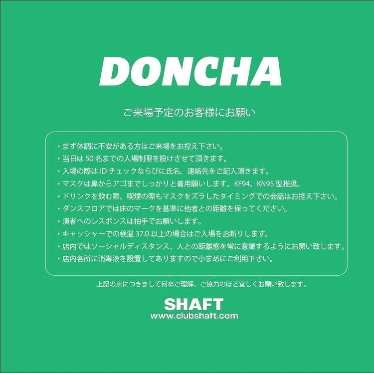 ご来場予定のお客様にお願い □まず体調に不安がある方はご来場をお控え下さい。 □当日は50名までの入場制限を設けさせて頂きます。 □入場の際はIDチェックならびに氏名、連絡先をご記入頂きます。 □マスクは鼻からアゴまでしっかりと着用願いします。KF94、KN95型推奨。 □ドリンクを飲む際、喫煙の際もマスクをズラしたタイミングでの会話はお控え下さい。 □ダンスフロアでは床のマークを基準に他者との距離を保ってください。 □演者へのレスポンスは拍手でお願いします。 □キャッシャーでの検温37.0以上の場合はご入場をお断りします。 □店内ではソーシャルディスタンス、人との距離感を常に意識するようにお願い致します。 □店内各所に消毒液を設置してありますので小まめにご利用下さい。