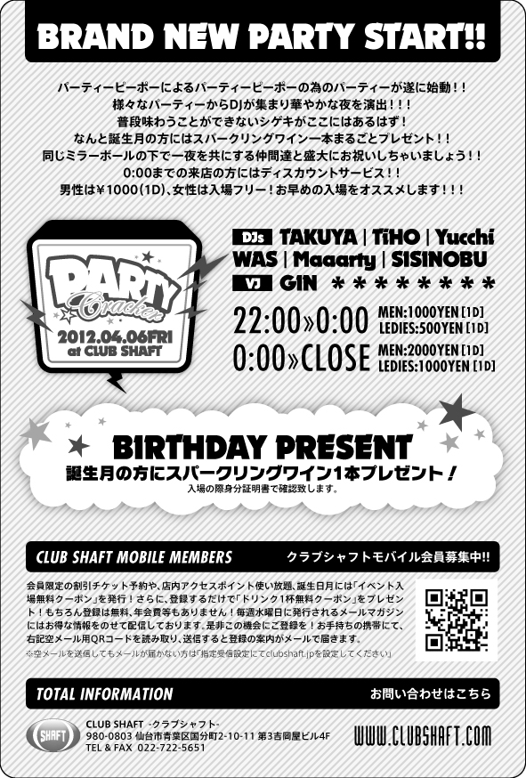 *info* ■mixiコミュニティ■ from〜?〜 : http://mixi.jp/view_community.pl?id=3652410 ■CLUB SHAFT■ TEL, 022-722-5651 〒980-0803 宮城県仙台市青葉区国分町2-10-11 第3吉岡屋ビル 4F. http://www.clubshaft.com/ ■DINING BASE fam■ TEL&FAX:022-711-0238 〒980-0811 宮城県仙台市青葉区一番町4-3-9 第3藤原屋ビル B1F http://ameblo.jp/fam-sendai/