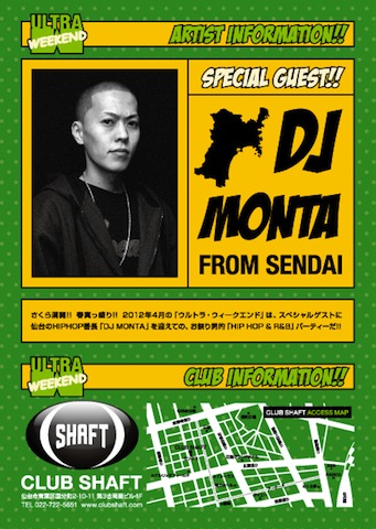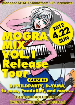13:00〜23:00 SHAFT×fam×from〜?〜 presents “MOGRA MIX VOL.1 Release Tour powered by pioneer dj 【EAST SIDE@CLUB SHAFT】×【WEST SIDE@DINING BASE fam】 今回は2店舗同時開催!! 【EAST SIDE】 会場 : CLUB SHAFT OPEN / CLOSE 13:00 - 23:00 TEL, 022-722-5651 〒980-0803 宮城県仙台市青葉区国分町2-10-11 第3吉岡屋ビル 4F. http://www.clubshaft.com/