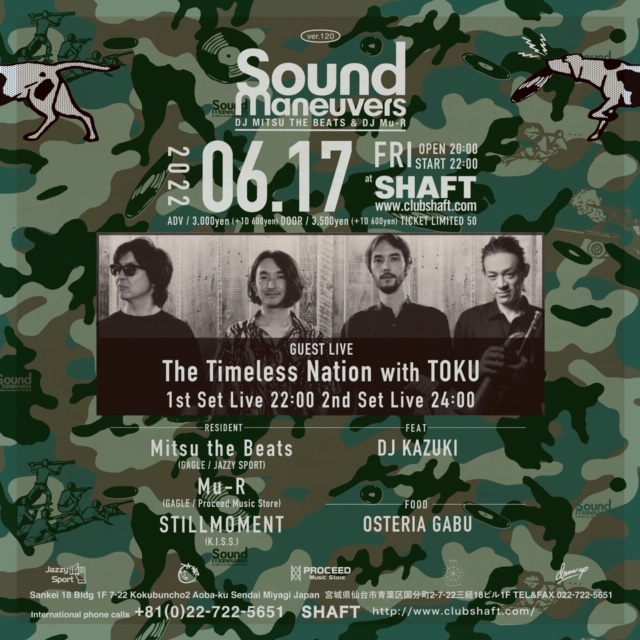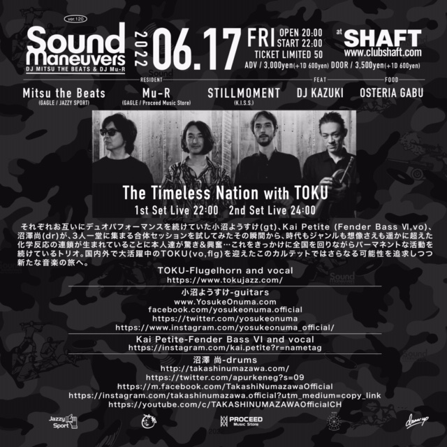 SOUND MANEUVERS ver.120ADV / 3,000yen(+1D 600yen) DOOR / 3,500yen(+1D 600yen) TICKET LIMITED 50