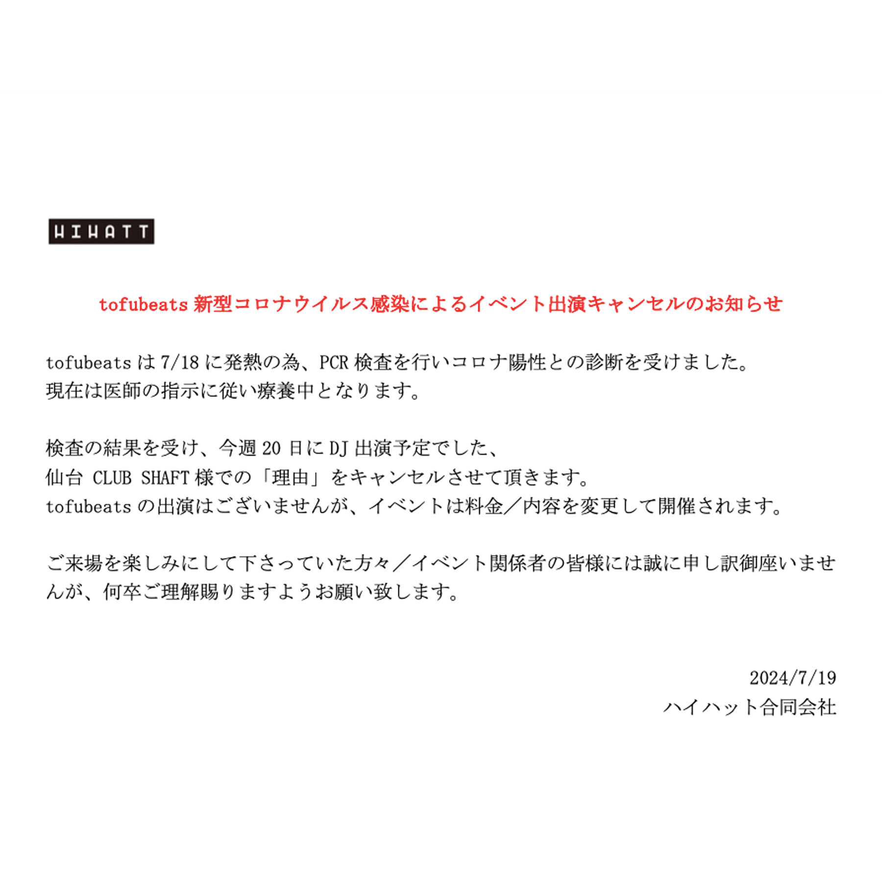 18:00〜 tofubeatsさん出演に関して