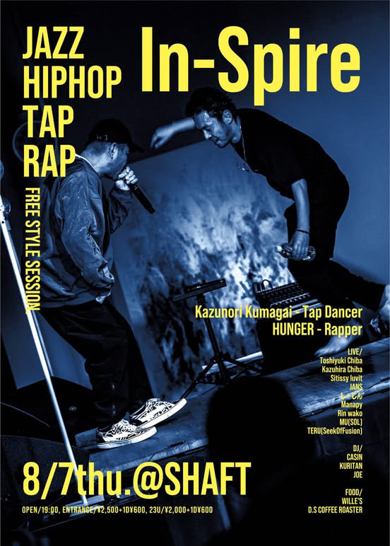19:00〜 In-Spire JAZZ+HIPHOP+TAP+RAP Free Style Session.