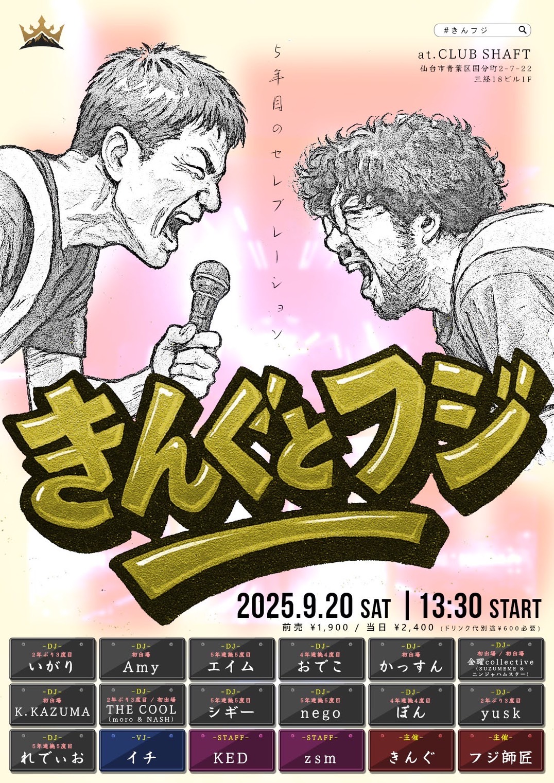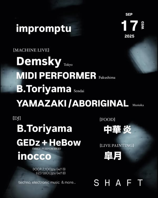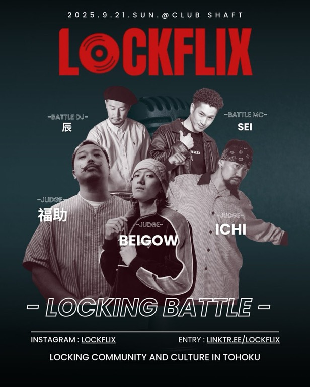 12:00〜 LOCKFLIX vol.3LOCKFLIX vol.3 日時: 2025.9.21.Sun 本戦スタート 17:00予定 会場: Club Shaft (宮城県仙台市青葉区国分町2-7-22 三経18ビル1F) 予選 : 12:00スタート (U15 → Adult)